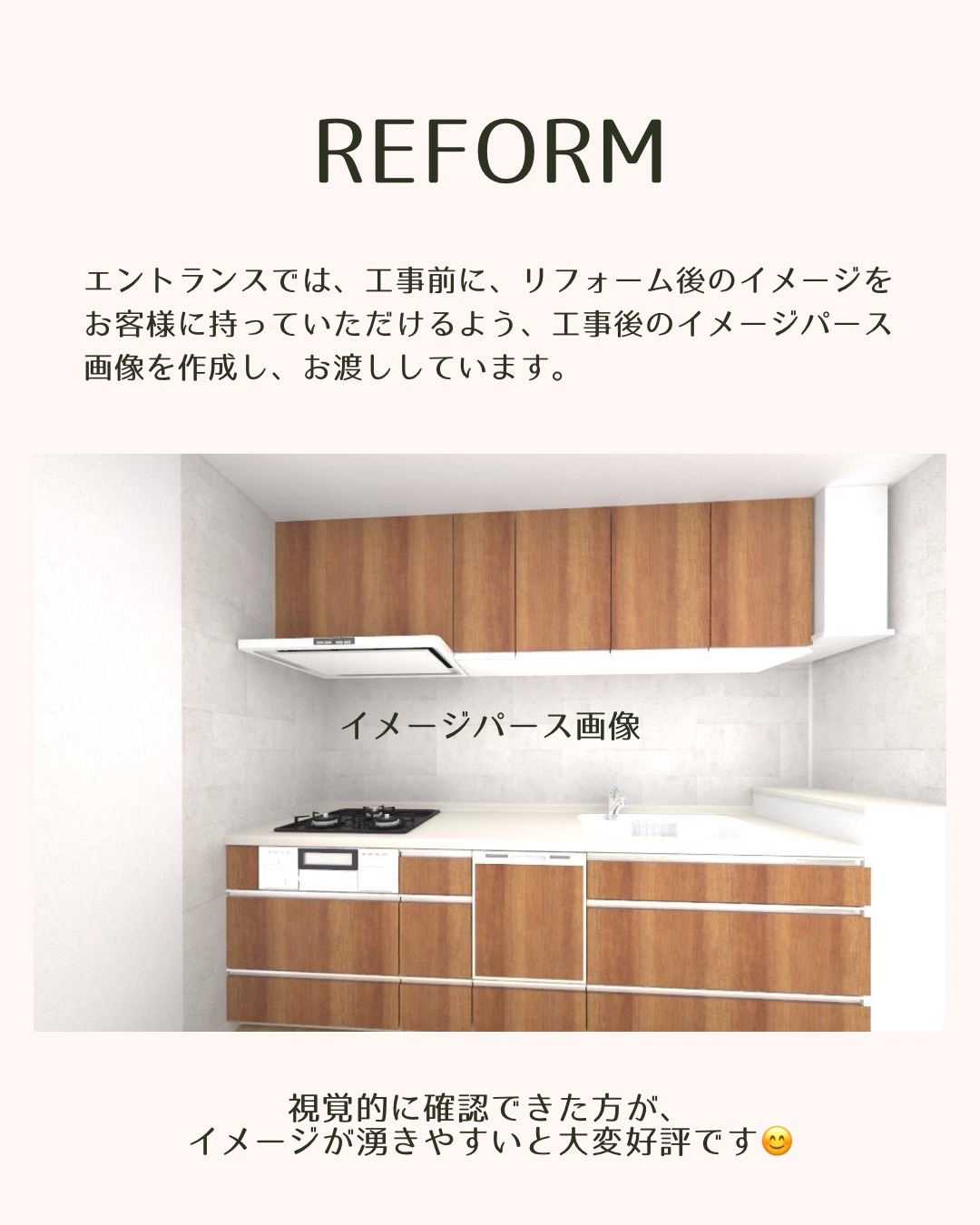 エントランスでは、工事前に、お客様にリフォーム後のイメージを持っていただけるよう、